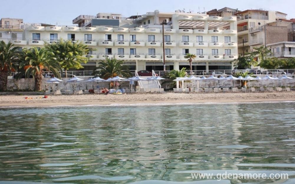 Das Hotel ist brandneu, aus den besten Materialien gebaut, in einer schönen und angenehmen Umgebung, mit einem installierten Sicherheitssystem, drahtlosem Internet und Annehmlichkeiten für Menschen mit besonderen Bedürfnissen in den öffentlichen Bereichen. Es verfügt über 57 geräumige Zimmer, die ergonomisch eingerichtet und mit modernen Holzmöbeln aus echter Eiche in Kombination mit feinen italienischen Materialien in den Farben des Meeres (Blau und Grau) eingerichtet sind. Jedes Zimmer ist mit einer Wischkarte ausgestattet, die die Bewegung der Gäste überwacht, während sie sich in den Zimmern aufhalten. Alle Zimmer verfügen über separate Heizung, Schallisolierung, Hitzebeständigkeit, gepanzerte Türen, alle modernen Annehmlichkeiten eines 4-Sterne-Hotels und eine geräumige Veranda mit Blick auf das Meer und den Olymp. Die Badezimmer sind mit Hygieneprodukten wie Carron und Gsi ausgestattet, während die Zahnpasten von der italienischen Marke La Torre stammen. Balkone, Veranden und Treppen sind aus weichem, rostfreiem Metall, das ein raffiniertes, schlichtes Design hat. In den öffentlichen Bereichen befinden sich: Rezeption, Lobby, Restaurant, Café-Bar, ein als Konferenzraum genutzter Raum mit einer Kapazität von 100 Personen, zwei Aufzüge und eine Tiefgarage.