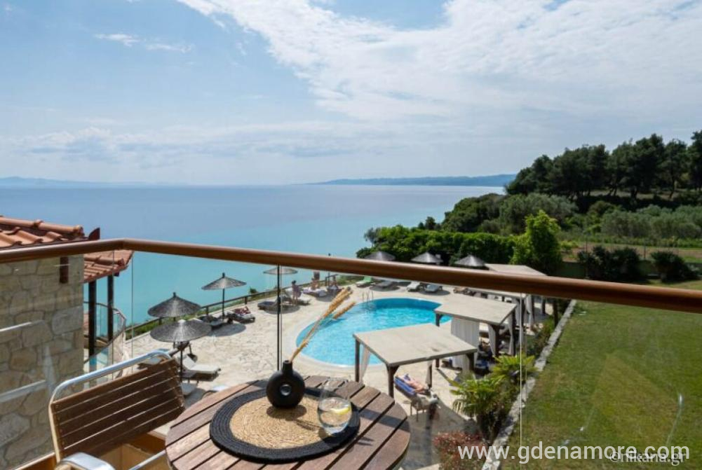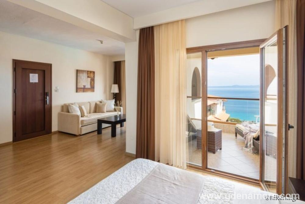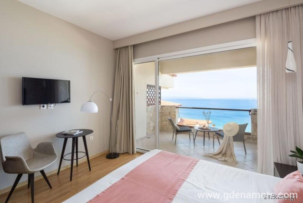 Blue Bay Halkidiki is located on a hill, about 60 meters above the beach, and offers two outdoor swimming pools with an exceptional view of the Gulf of Torono, as well as a spacious sun terrace with sunbeds and umbrellas. All rooms have a panoramic view of the sea. They are decorated with taste, in a combination of traditional and modern design. Each room has air conditioning, a flat screen TV and a mini fridge, while some units also have mini hi-fi systems.