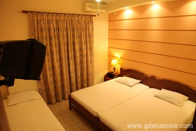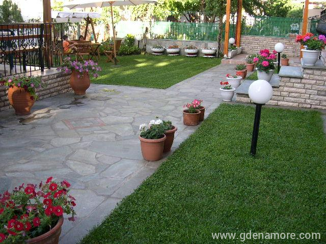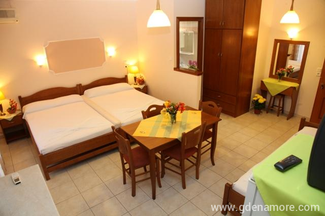 The furnished apartments of mrs. Vassiliki are situated in Platamonas of Pieria. There you can have dreamy vacations in a family environment. The apartments consist of one spacious room, kitchen with refrigerator and all the cooking utensils, bathroom and hall. Every room has also a balcony. In each room there is a T.V. , air condition, ventilator personal heating and free internet/wi-fi. You can enjoy your coffee at the balcony of your apartment or down at the garden where your kids can play freely and with safety. At the garden there is also a barbecue, central T.V.with wide screen and DVD Player.