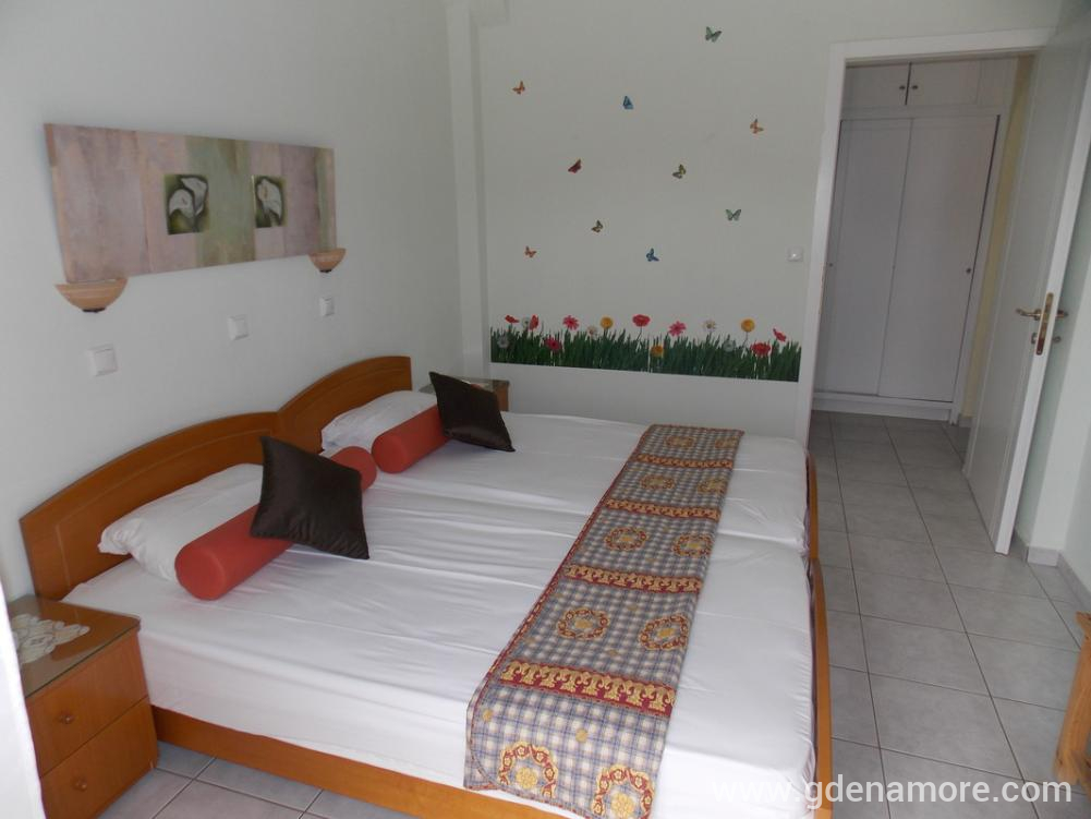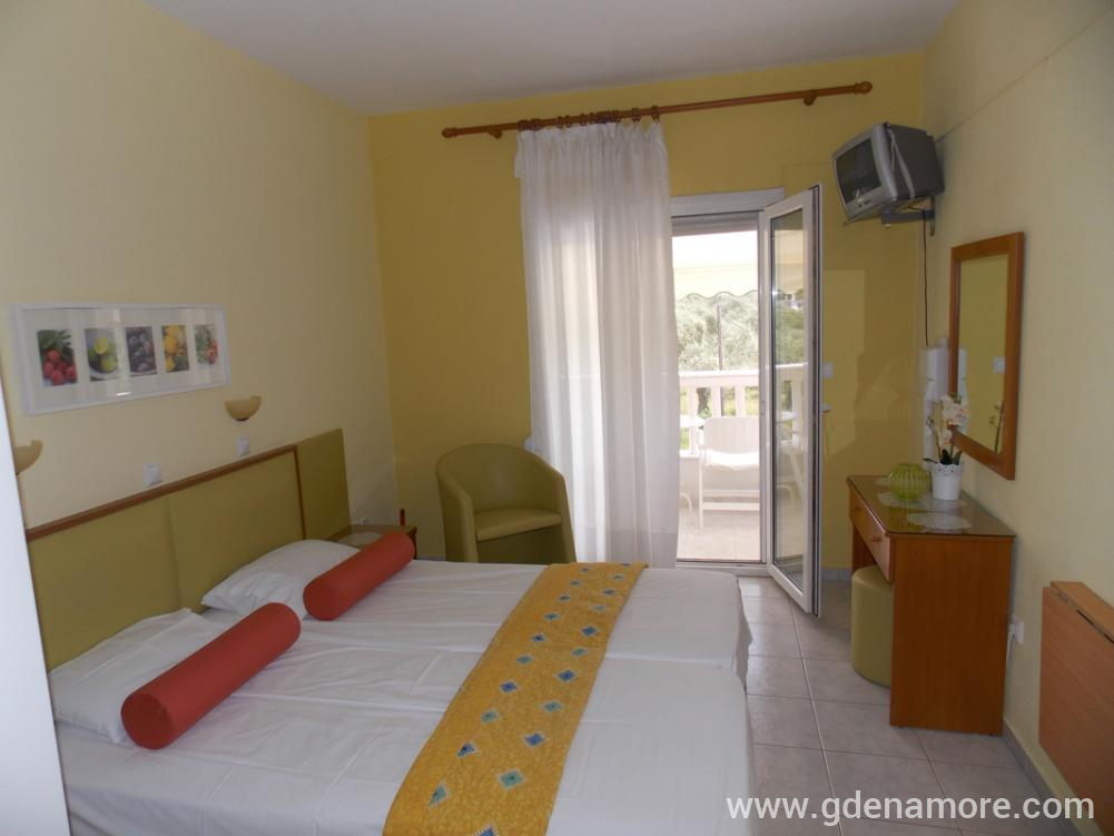 When you get off the ferry, follow the direction to the right and drive along the sea on the main road (about 300m). When you reach the part where the narrow road leads straight to the Hotel Vournelis and the beach of the same name, continue on the main road and turn left. 150m later you come to the first big crossroads (with Dimitriadu Street) and turn left there. Ioli Apartments is located 200m after the turn, on the right side of the street (on the road from Limenas to Prinos, on the corner, after the gas station and Paradise Studios).