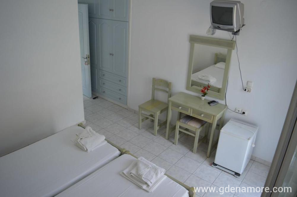 The facility has five air-conditioned double rooms with an area of about 22 m², with one double bed or two joined single beds. In two units, it is possible to add a folding extra bed for a third person for an additional fee. The rooms do not have a kitchen, only a small fridge and basic dishes. They are equipped with a TV, mosquito nets, a bathroom and a balcony with a view of the sea or the yard. A shared kitchen is also available to guests.