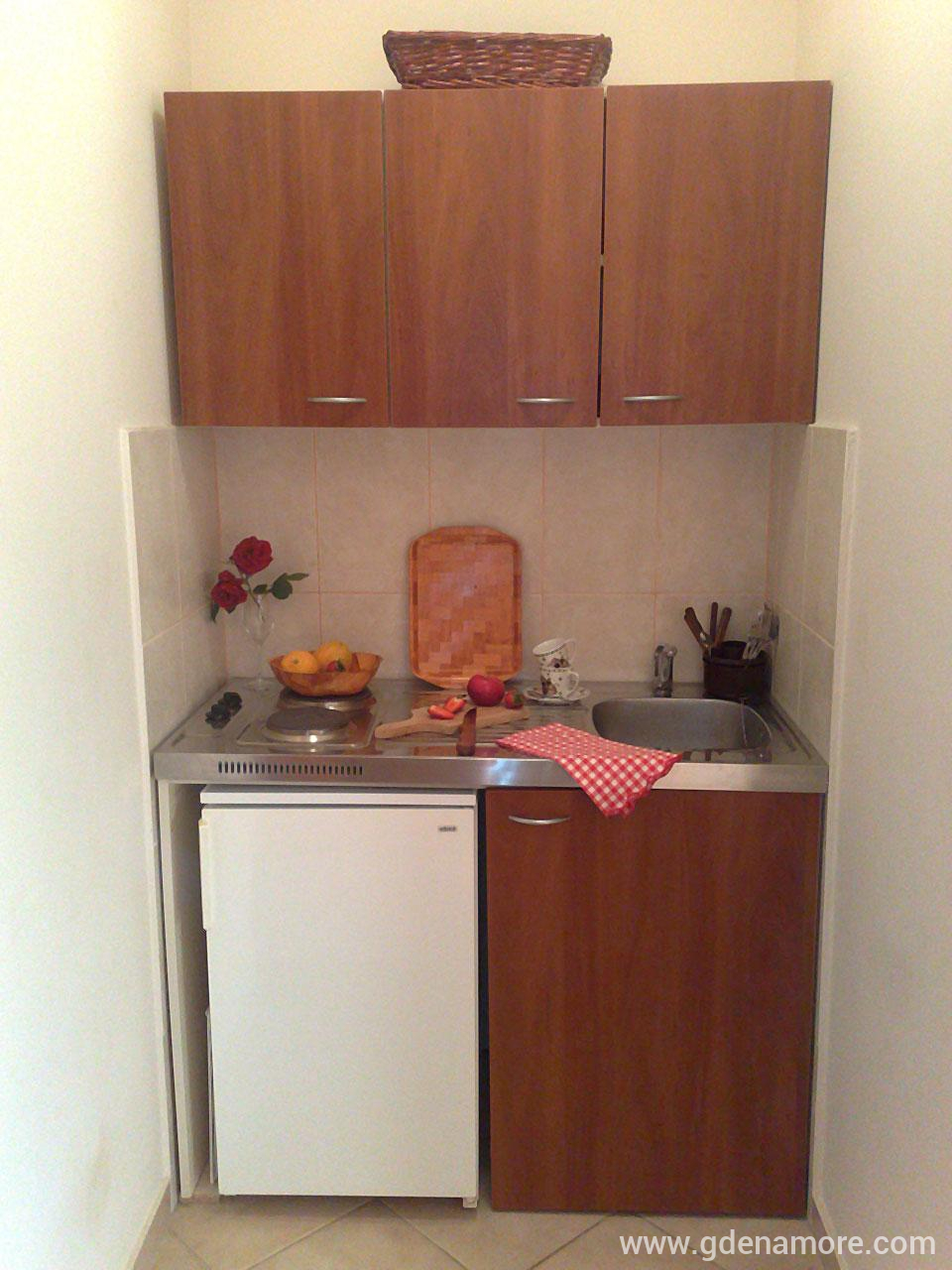 Ovaj studio je opremljen za 2 osobe. Sadržaj: - 1 bračni ležaj - garderober - TV - klima - trpezarijski deo - mini-kuhinja sa kuhinjskim posuđem - kupatilo - balkon sa balkonskim namještajem