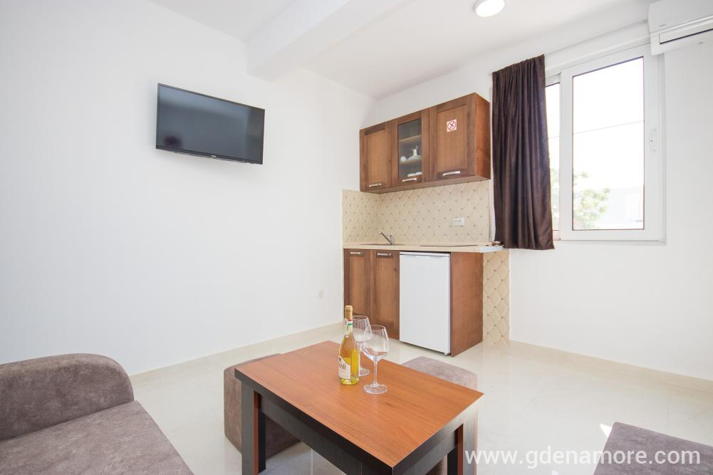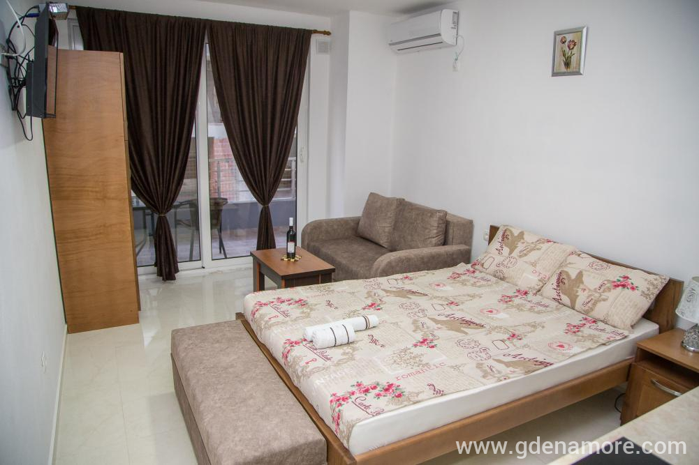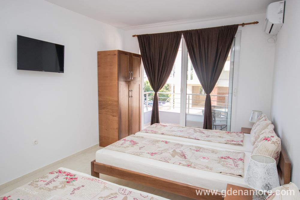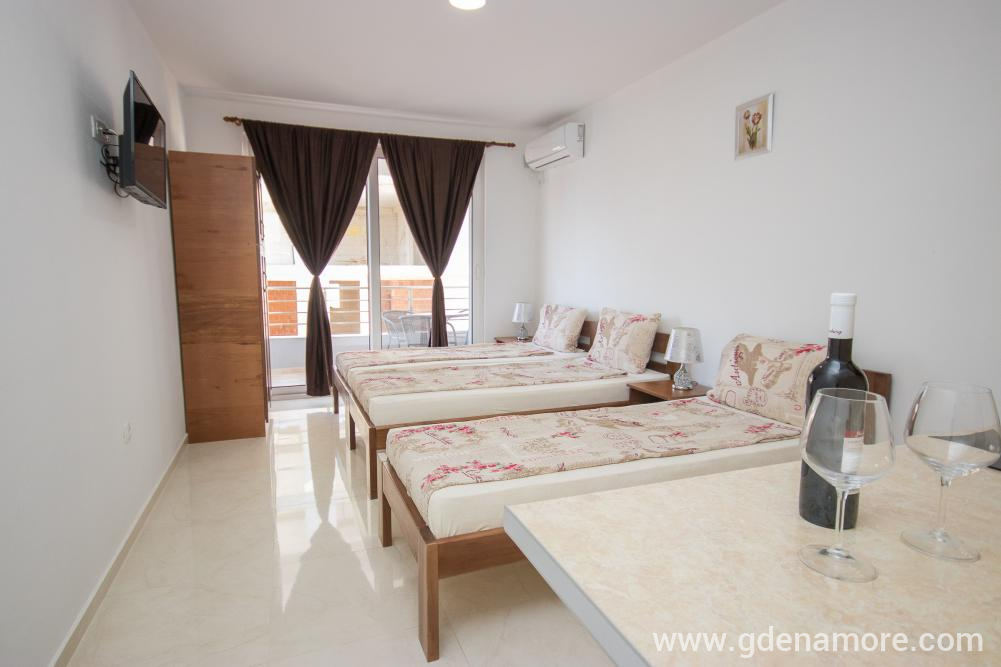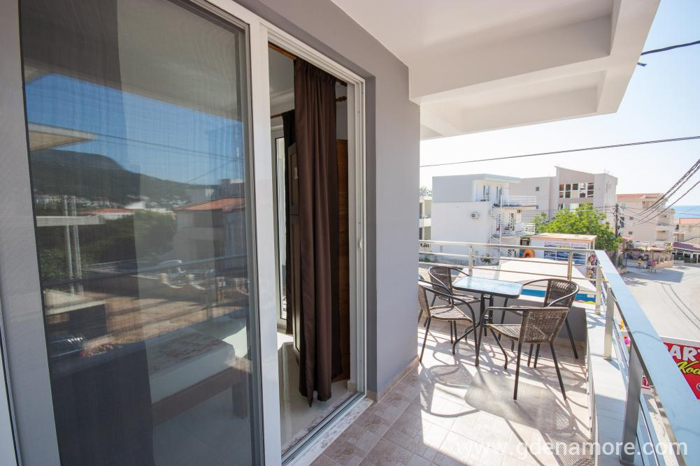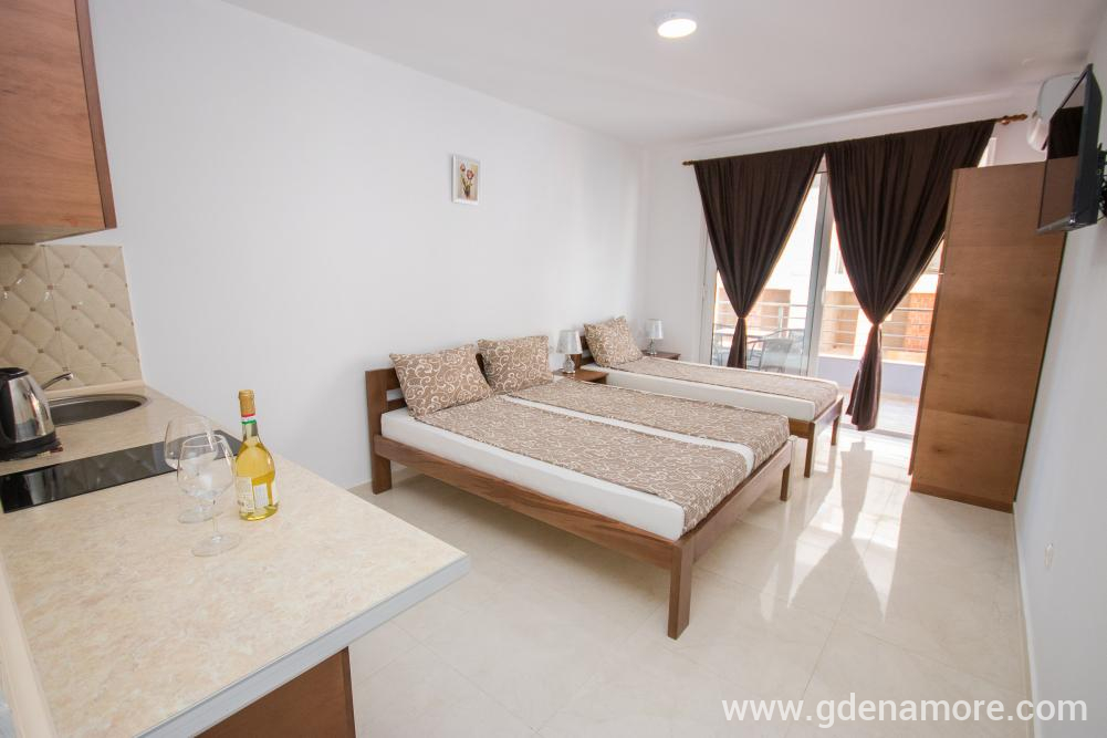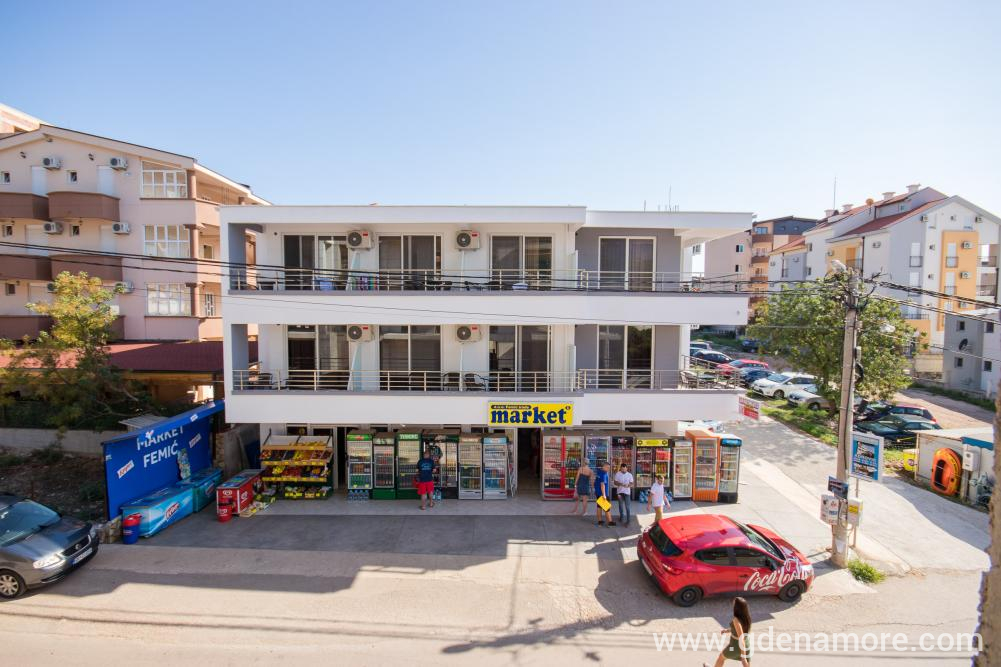 Apartments "Kod Kurta" is a newly built facility that has been in operation since June 2018, located in the tourist resort Dobre Vode on the beach Veliki Pjesak. The house contains 8 units, of which 6 apartments and 2 apartments. The house is located 9km from Bar pud Ulcinja. Distance from the beach less than 100m. Each apartment has a kitchen, bathroom, TV, air conditioning, WIFI and its own terrace. Each apartment has a terrace with a beautiful view of the sea and the mountain Lisinj. As part of the house on the ground floor there is a market and in the immediate vicinity there are restaurants, bakeries, groceries, fast food, pastry shops, pharmacies, etc. On the beach there are also tourist boats with which you can visit more distant beaches on the coast of Montenegro, and see the beauty of the coast of Montenegro. Dobra Voda has 3 beaches, of which Veliki Pjesak is the largest and most visited beach. Free parking is provided for all guests, also for guests who do not use their own transport we provide free transport by train or bus traffic from Bar. Our biggest gain is the satisfaction of each guest. With us you can always find pure homemade olive oil and olives, as well as wild pomegranate juice-syrup (Family business-tradition), which are available throughout the calendar year.