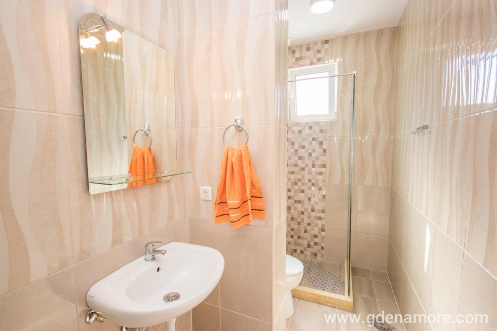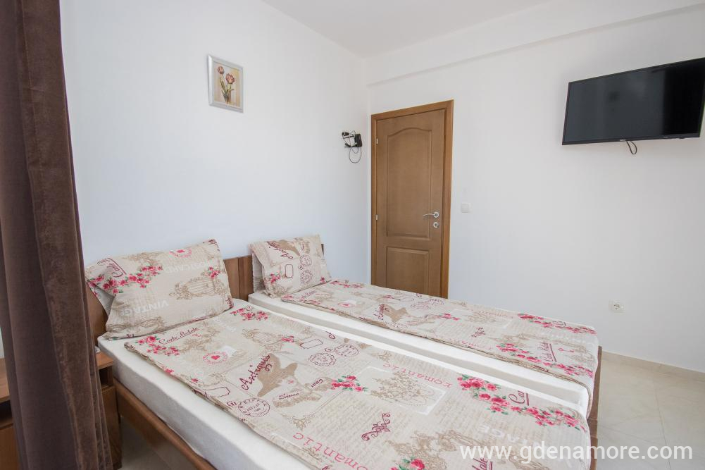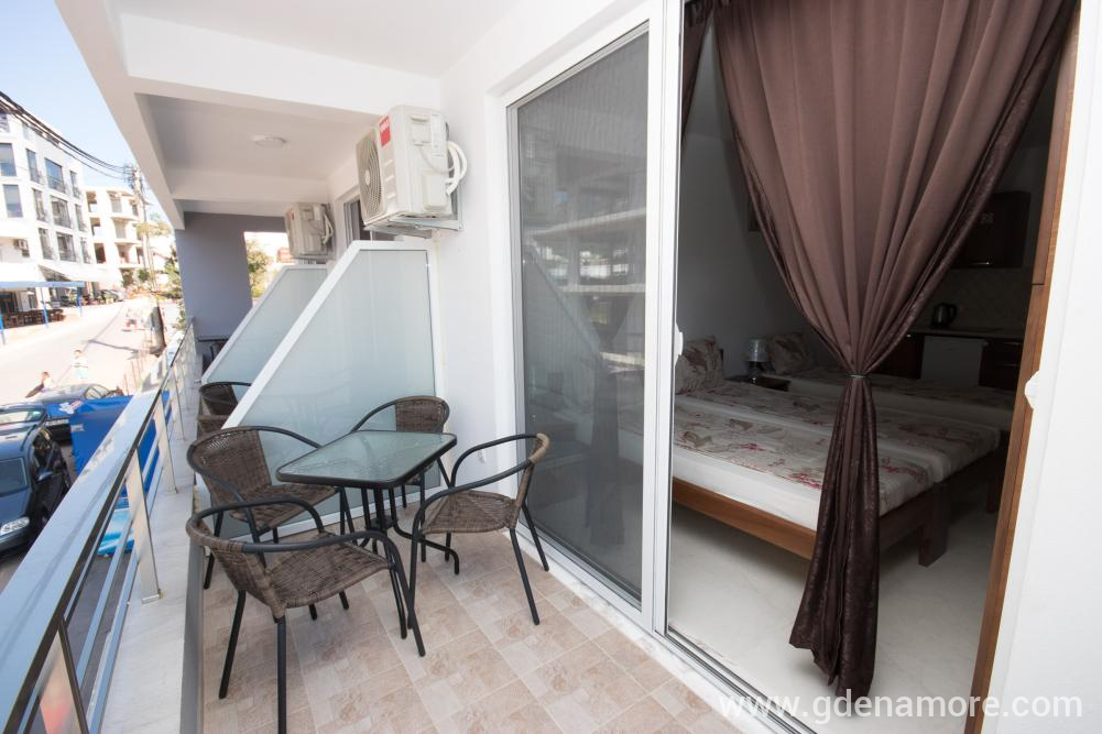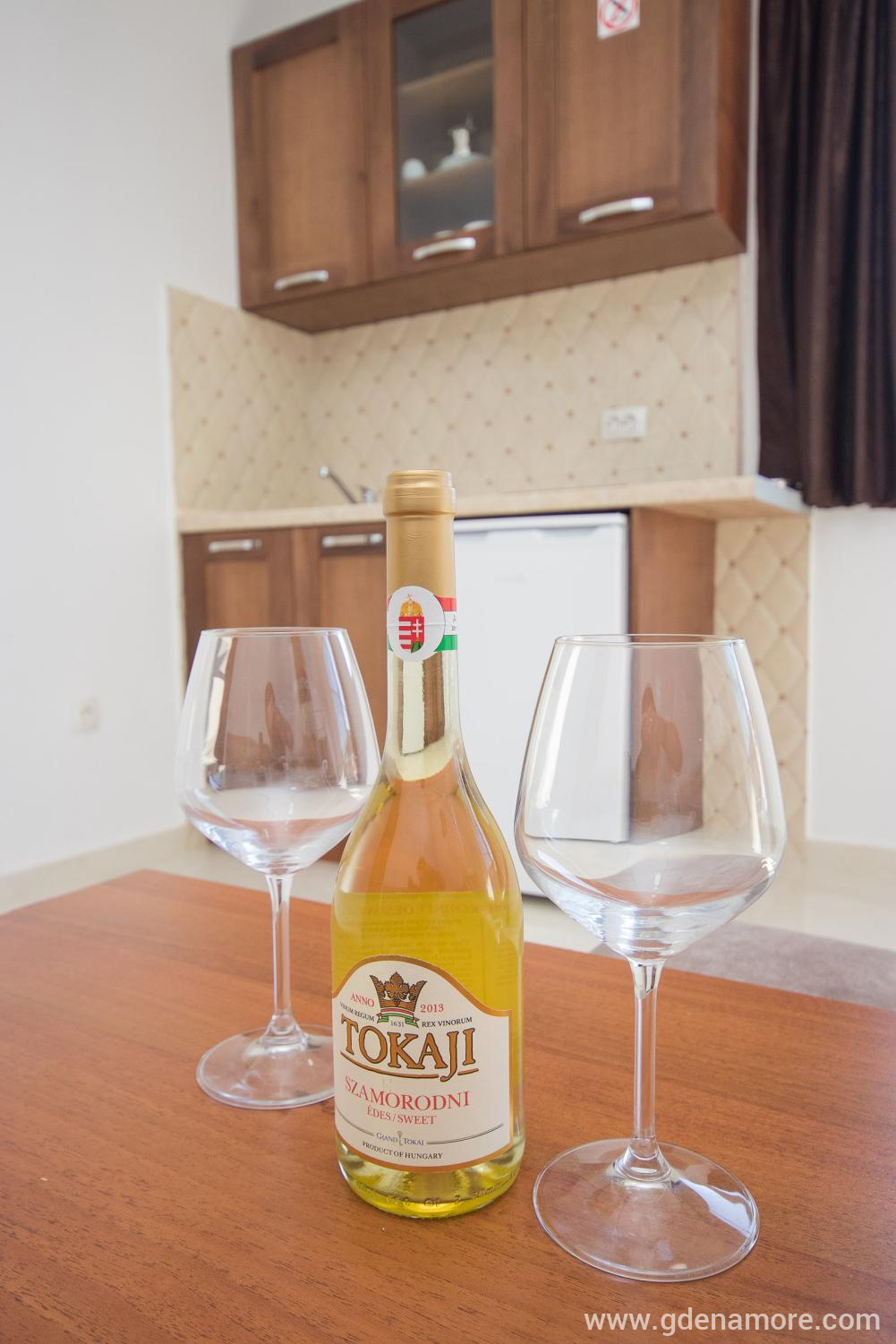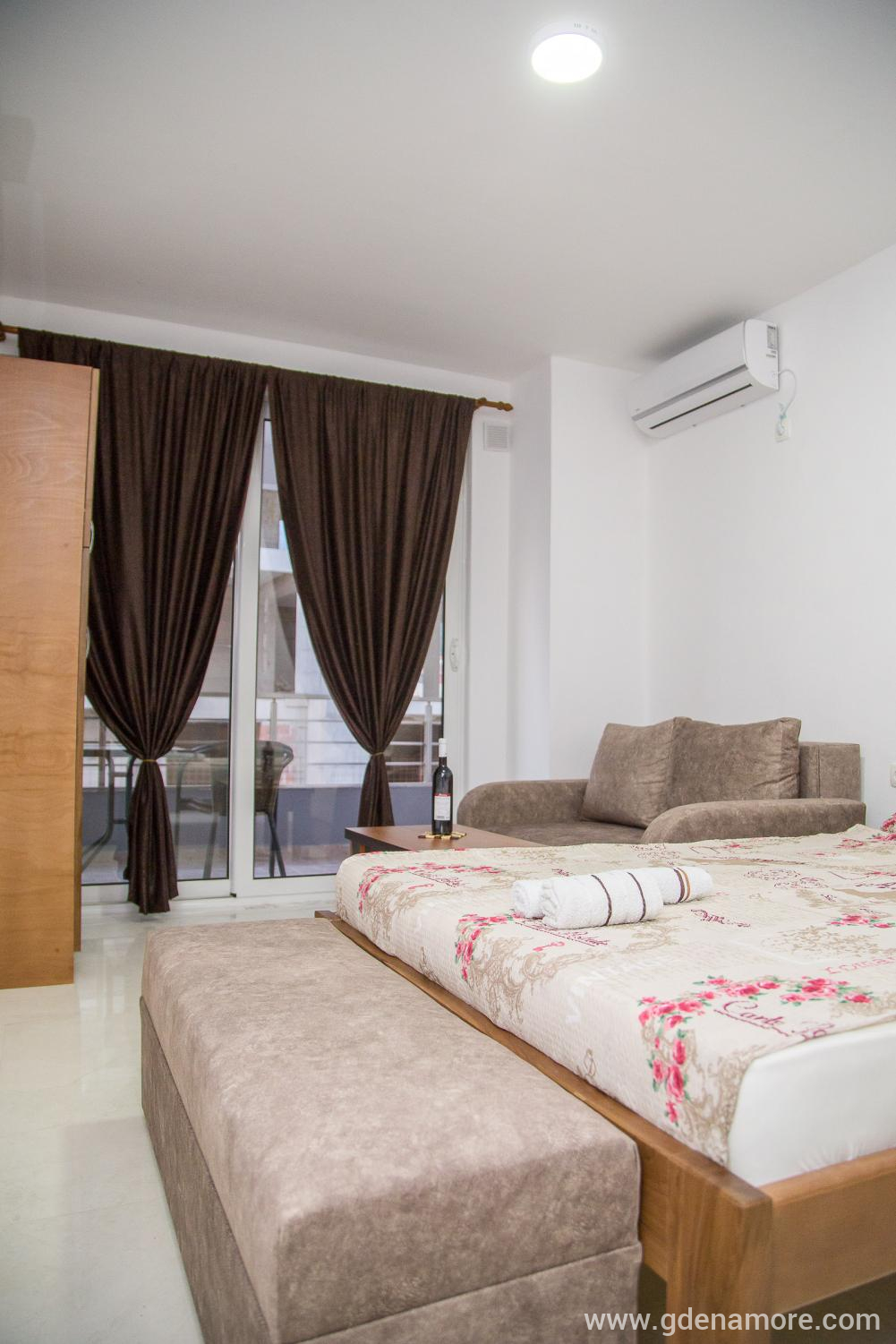 Apartments "Kod Kurta" is a newly built facility that has been in operation since June 2018, located in the tourist resort Dobre Vode on the beach Veliki Pjesak. The house contains 8 units, of which 6 apartments and 2 apartments. The house is located 9km from Bar pud Ulcinja. Distance from the beach less than 100m. Each apartment has a kitchen, bathroom, TV, air conditioning, WIFI and its own terrace. Each apartment has a terrace with a beautiful view of the sea and the mountain Lisinj. As part of the house on the ground floor there is a market and in the immediate vicinity there are restaurants, bakeries, groceries, fast food, pastry shops, pharmacies, etc. On the beach there are also tourist boats with which you can visit more distant beaches on the coast of Montenegro, and see the beauty of the coast of Montenegro. Dobra Voda has 3 beaches, of which Veliki Pjesak is the largest and most visited beach. Free parking is provided for all guests, also for guests who do not use their own transport we provide free transport by train or bus traffic from Bar. Our biggest gain is the satisfaction of each guest. With us you can always find pure homemade olive oil and olives, as well as wild pomegranate juice-syrup (Family business-tradition), which are available throughout the calendar year.