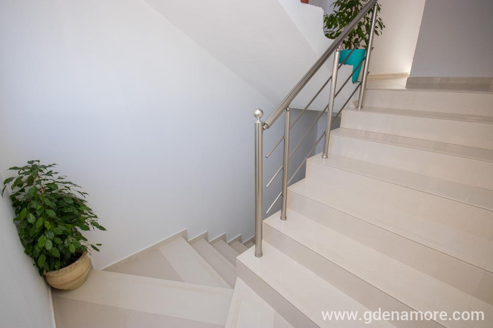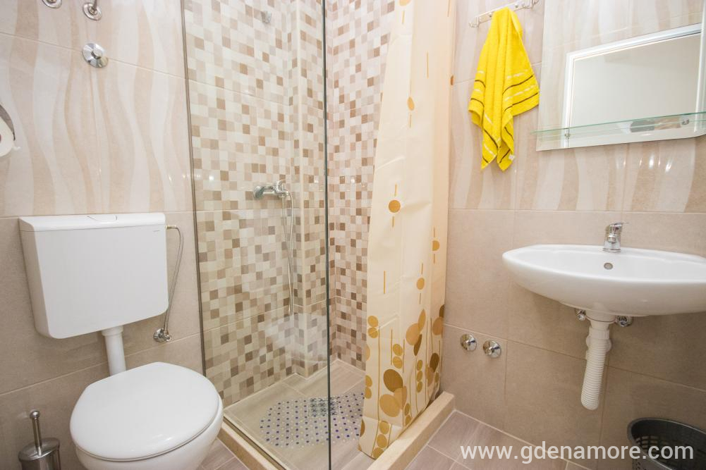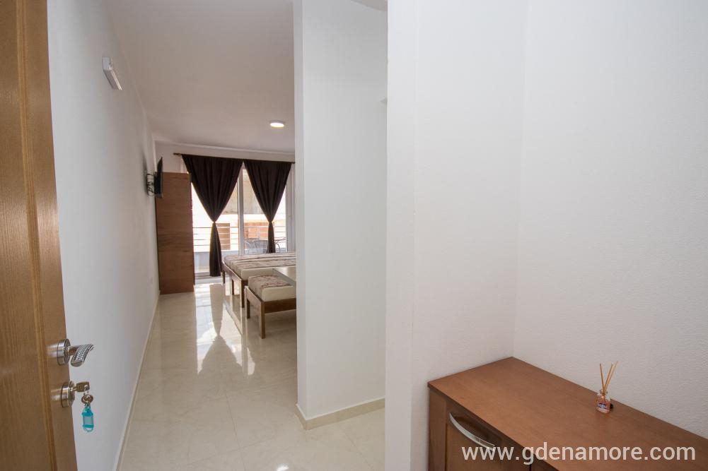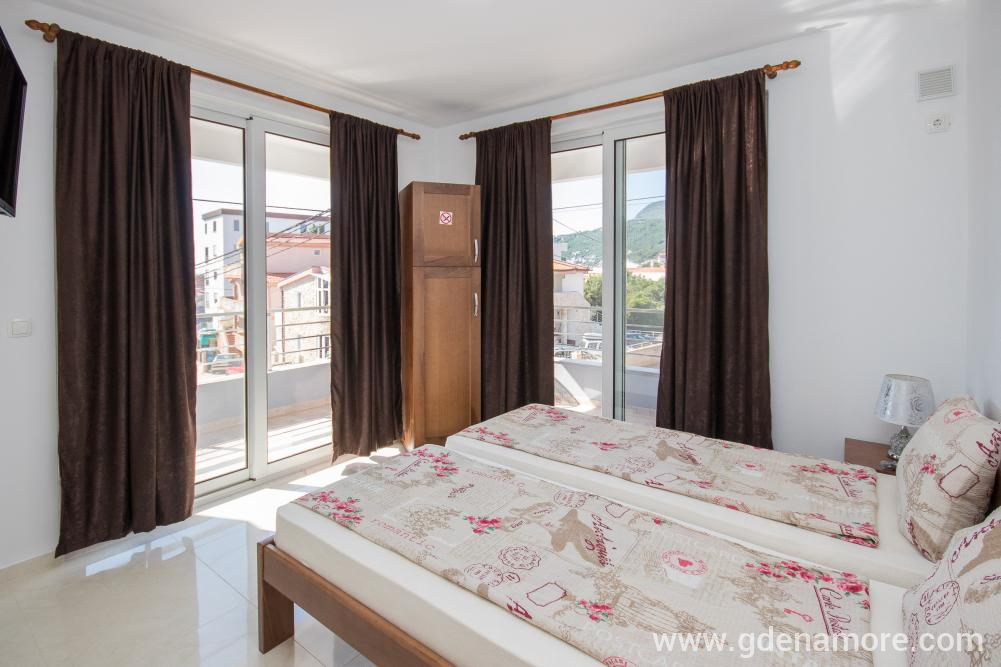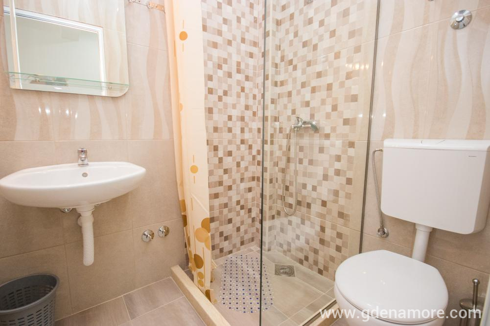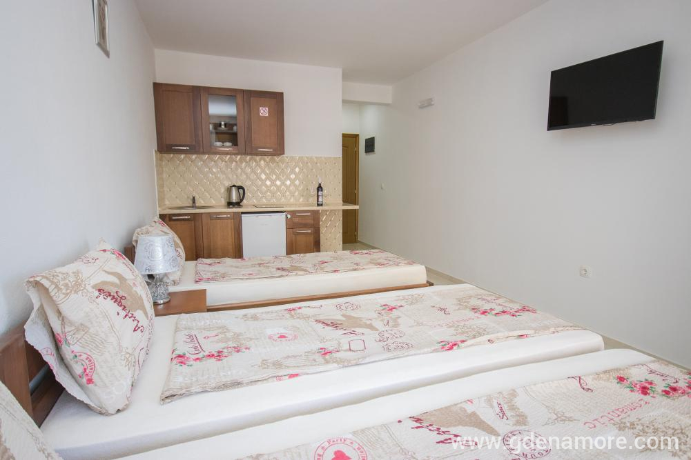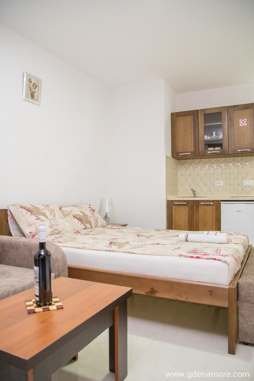 Apartments "Kod Kurta" is a newly built facility that has been in operation since June 2018, located in the tourist resort Dobre Vode on the beach Veliki Pjesak. The house contains 8 units, of which 6 apartments and 2 apartments. The house is located 9km from Bar pud Ulcinja. Distance from the beach less than 100m. Each apartment has a kitchen, bathroom, TV, air conditioning, WIFI and its own terrace. Each apartment has a terrace with a beautiful view of the sea and the mountain Lisinj. As part of the house on the ground floor there is a market and in the immediate vicinity there are restaurants, bakeries, groceries, fast food, pastry shops, pharmacies, etc. On the beach there are also tourist boats with which you can visit more distant beaches on the coast of Montenegro, and see the beauty of the coast of Montenegro. Dobra Voda has 3 beaches, of which Veliki Pjesak is the largest and most visited beach. Free parking is provided for all guests, also for guests who do not use their own transport we provide free transport by train or bus traffic from Bar. Our biggest gain is the satisfaction of each guest. With us you can always find pure homemade olive oil and olives, as well as wild pomegranate juice-syrup (Family business-tradition), which are available throughout the calendar year.