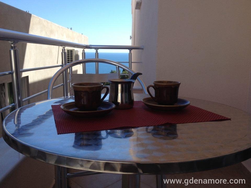 Studio apartman se nalzi na trecem spratu kuce i ima terasu sa predivnim pogledom na more. Soba se sastoji iz bracnog kreveta, kauca na razvlacenje, mini kuhinje, toaleta. Kompletno je opremljen i namjenjen svima koji istinski zele da se odmore i uzivaju u pogledu na more.