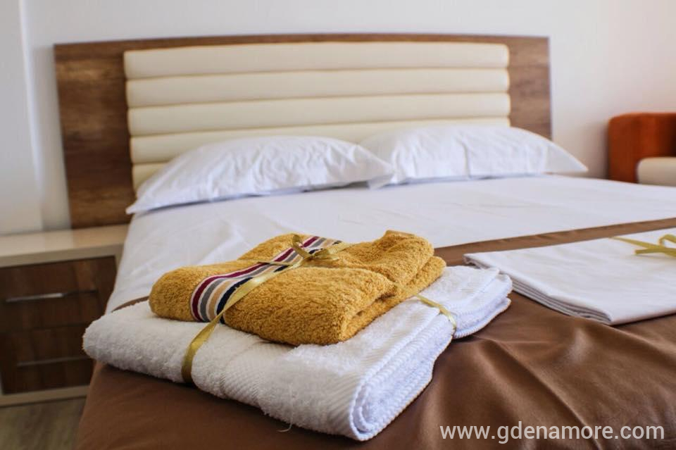 Dvokrevetna soba sa bracnim krevetom pored sopstvenog kupatila u sobi posjeduje i frizider. Ispred kuce ima basta gdje se nalaze sto sa stolicama gdje gosti mogu uzivati u pogledu na more