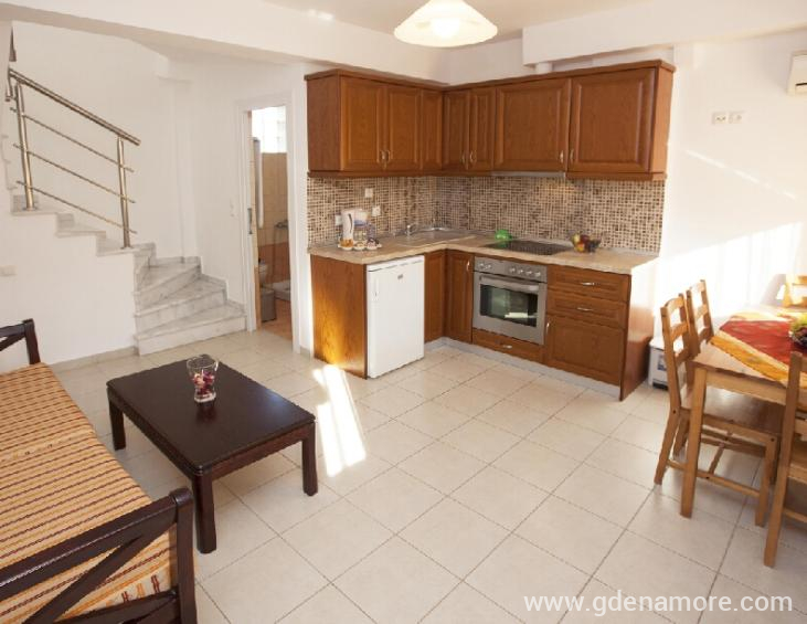 C'est un bâtiment moderne qui compte quatre penthouses (deux niveaux) et un studio à trois lits. Au premier niveau, il y a un salon avec une cuisine entièrement équipée (grille-pain, cuisinière avec four, bouilloire électrique, suffisamment d'ustensiles pour cuisiner). Le salon est confortable et dispose d'un petit balcon, d'une table à manger et d'un canapé qui se plie en deux lits simples de dimensions standard. Au deuxième niveau se trouve une chambre avec un lit double, mais aussi une véranda très spacieuse (10 à 15m2) avec parasols. Tous les penthouses ont une vue sur la mer, deux climatiseurs (à la fois dans la chambre et dans le salon).