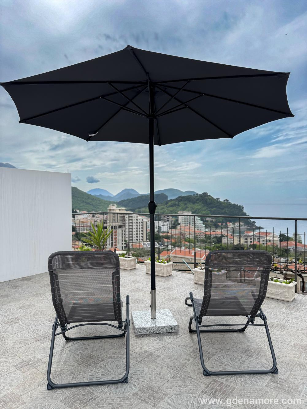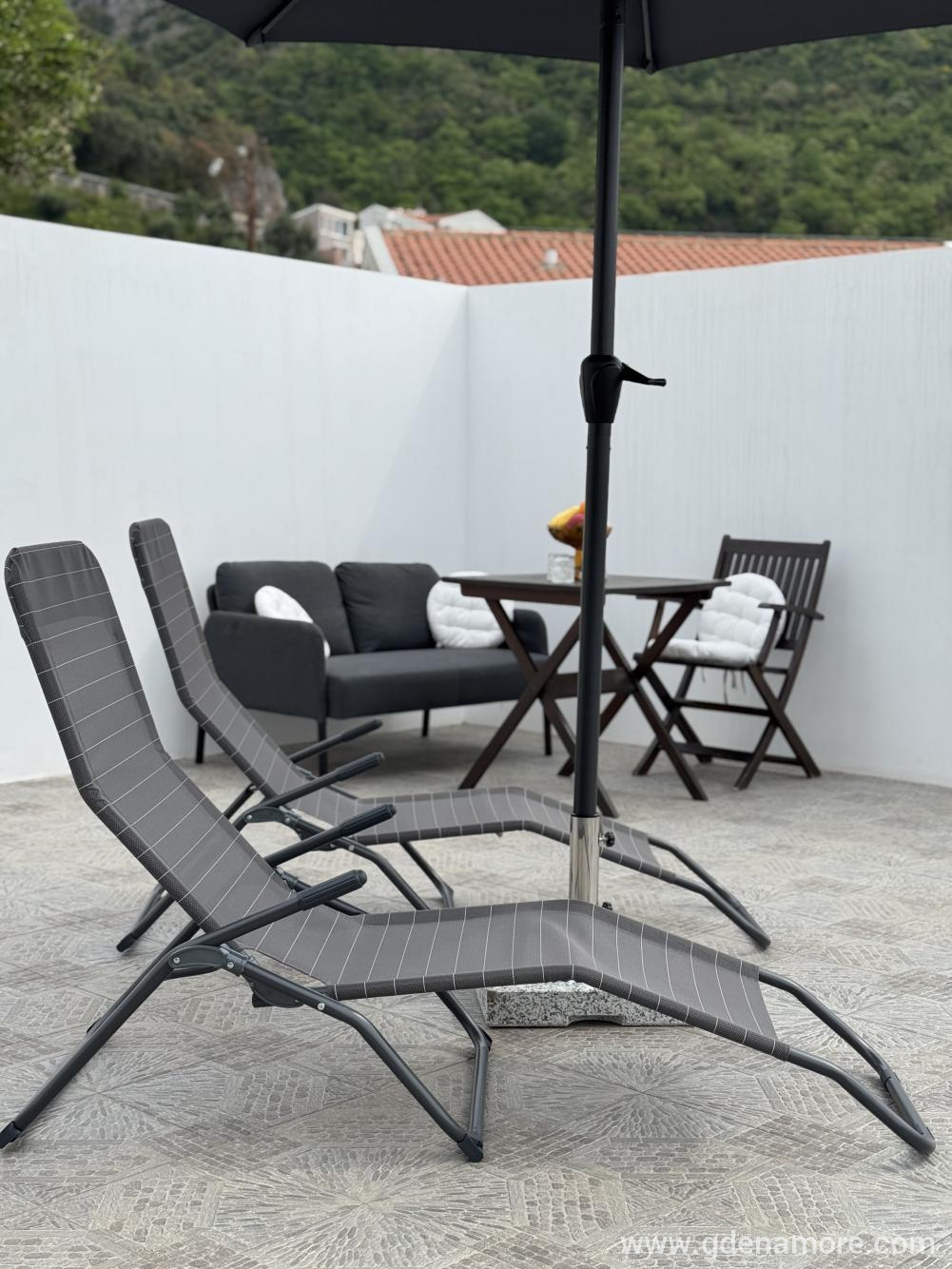 L'appartamento dispone di una terrazza con sedie a sdraio e ombrellone, da cui si può godere di una vista unica sul panorama della città, sulla costa e sulle due isole di Katič e Sveta Neđelja.