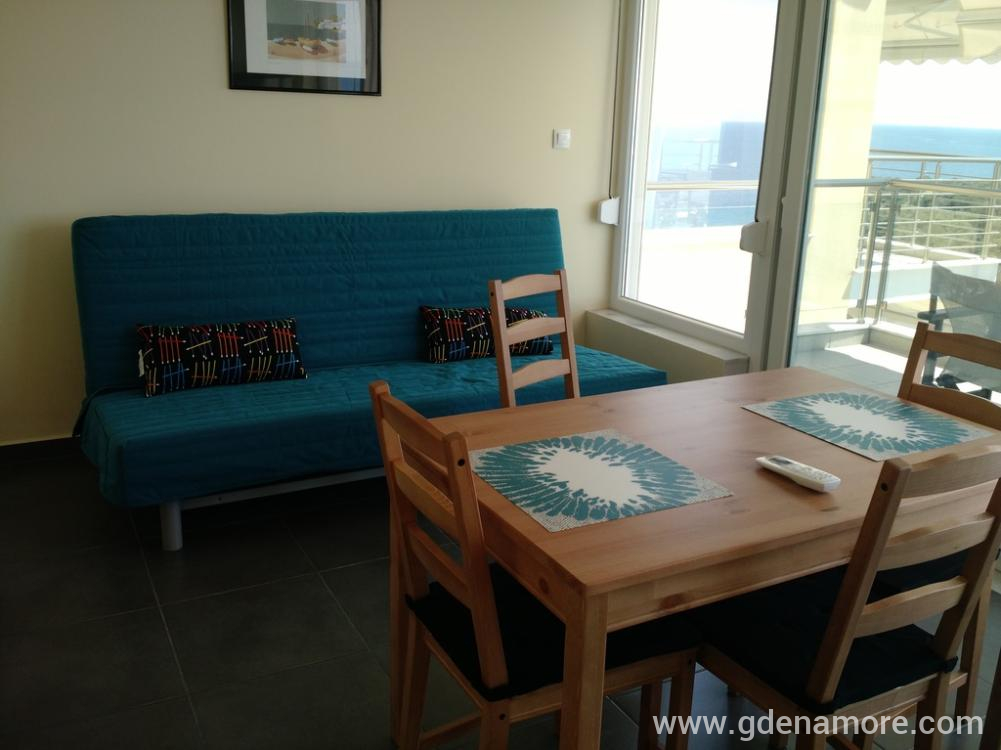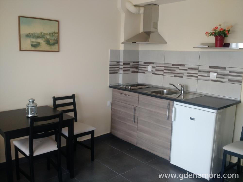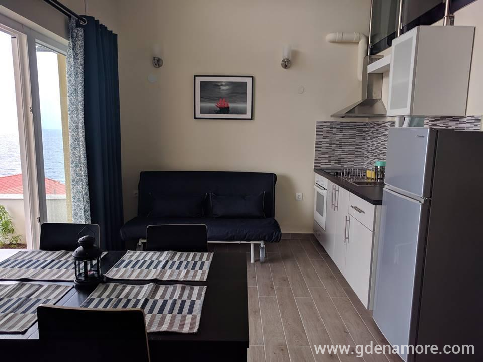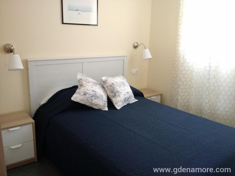 Vi tilbyr to leiligheter med havutsikt. Leilighet i første etasje (32m2), 4-roms leilighet II (AMA:00002189921), soverommet har en dobbeltseng, mens stuen har en sovesofa og et fullt utstyrt kjøkken med stekeovn. Leiligheten i første etasje, 4-roms leilighet I (AMA:00002189857), er litt mindre (29m2), har samme planløsning, bortsett fra at den ikke har stekeovn på kjøkkenet og har et mindre kjøleskap. Begge leilighetene har en stor terrasse.