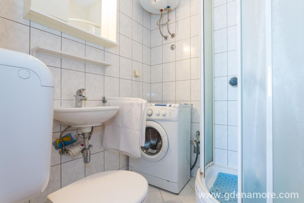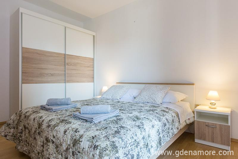 Overnattingstilbud Leilighet 1 har 2 soverom en for 2 personer, den andre for 1 person som tillater overnatting for 4 personer hvis du bruker en sofa i stuen. Den fjerde personen betaler ikke noe prisen er allerede belastet. Det er en annen stue, kjøkken, bad med dusj. Kronen av alt er en stor terrasse hvorfra det er en vakker utsikt over byens panorama og Adriaterhavet. Bortsett fra leiligheten Det er en bilparker. Busstasjonen ligger 40 meter fra leiligheten som gir rask forbindelse med alle deler av byen