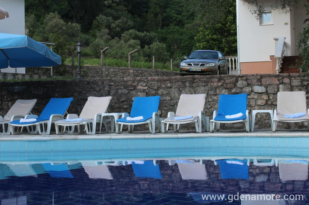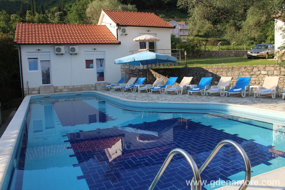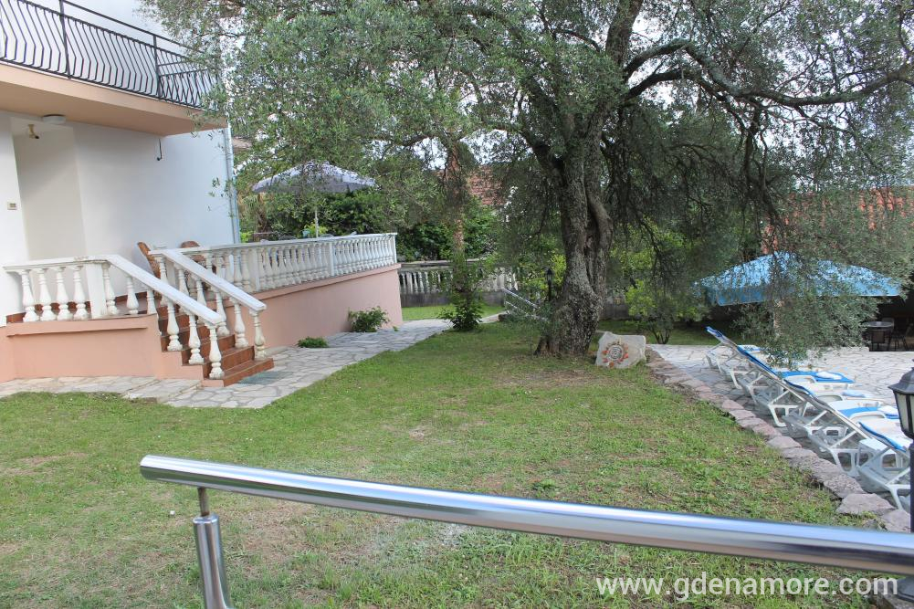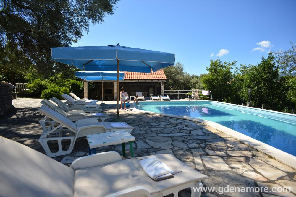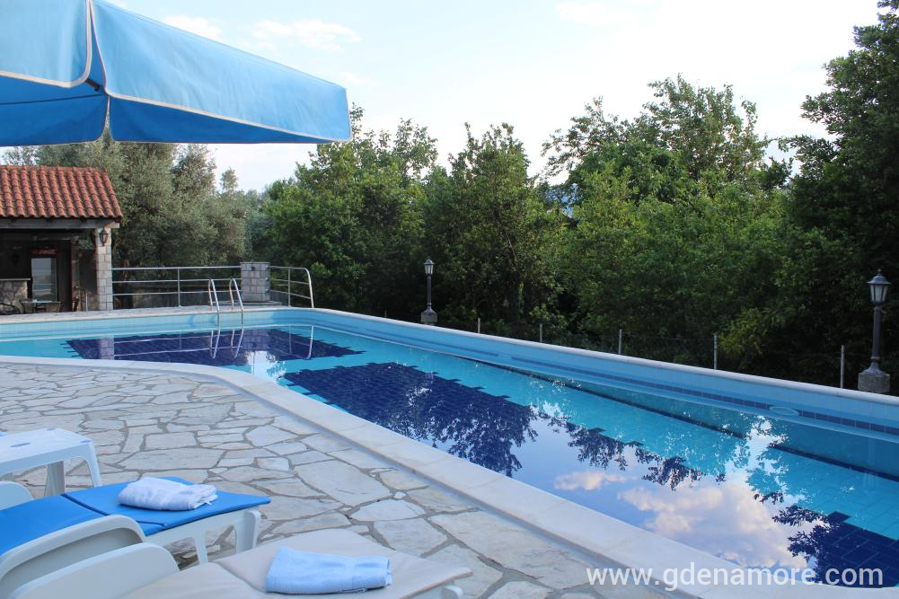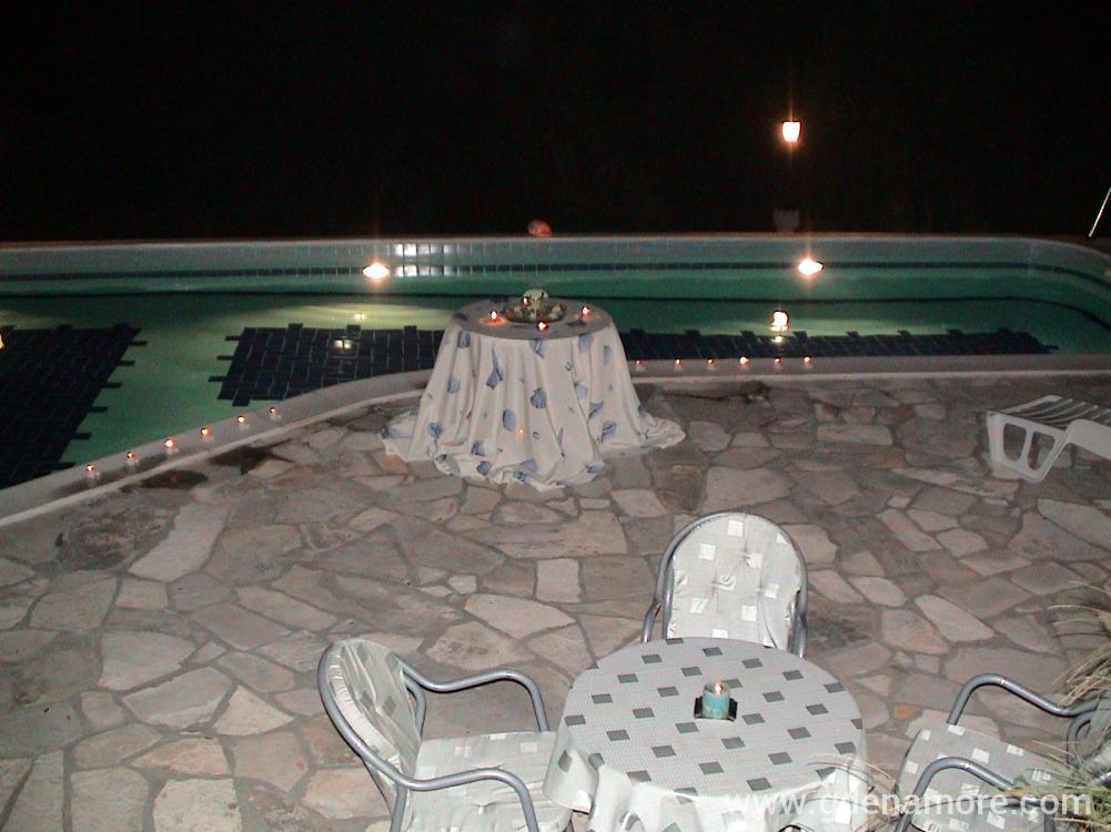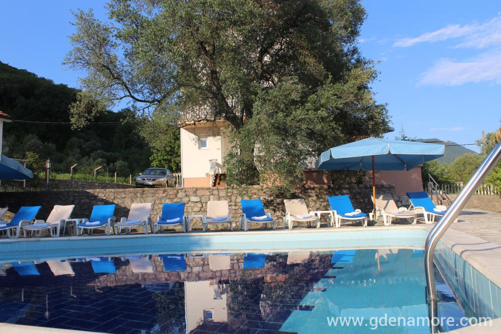 Vila u kojoj se nalaze apartmani je dvospratna, blizu mora, mada ne na samoj obali, tako da je zaštićena od buke i gužve. Smeštena je u prelepom okruženju na mestu gde se uklapaju morski i planinski vazduh, Sa severne strane prostire se šuma prekrivena starim maslinama, a na jugu prelep pogled na more. Prostrano i lepo dvorište, bazen sa đakuzijem, više terasa, roštilj i bar, upotpunjuju ambijent dvorišta. Od prošlog leta gostima su na raspolaganju i novi apartamni u novom objektu odmah pored bazena. Svi apartmani poseduju klima uredjaje, tv, kuhinje su potpuno opremljene i poseduju sve što vam je potrebno za komforan odmor. Svi gosti imaju obezbedjen parking. Besplatan internet je dostupan u svim apartamima, bazenu i dvorištu. Ceo kompleks je jako pogodan za porodice sa decom.