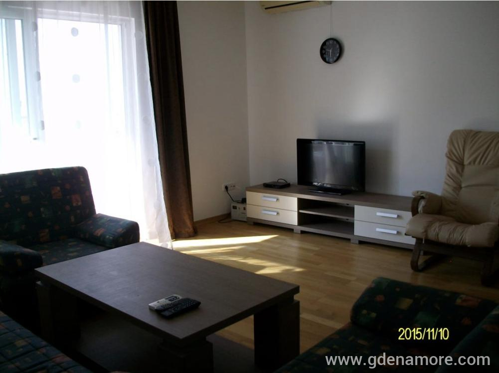 Izdaje se stan(60m2)koji se nalazi u zgradi oko 800m od plaze.Tiho mjesto idealno za porodicu.U stanu ima spavaca soba sa francuskim lezajem.Dnevni boravak sa garniturom-trosjed,dvosjed i fotelja,sve na razvlacenje.
