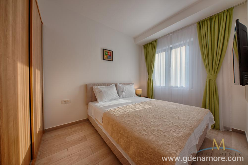 Ovo je apartman u koji moze da se smesti od 4 do 6 osoba. Apartman je potpuno namesten, nov, opremljen u junu 2019. godine. Ima kuhinju, novu, potpuno opremljenu, kupatilo, balkon, tv, kablovsku, wi fi, klima uredjaj, obezbedjen parking u objektu, lift, u cenu je ukljuceno i ,ukoliko zelite, ciscenje sobe i menjanje peskira a na svakih 7 dana i posteljine... Recepcija koja radi do 22.00h i kontakt telefon osobe koja ukoliko Vam nesto zatreba, moze pomoci.