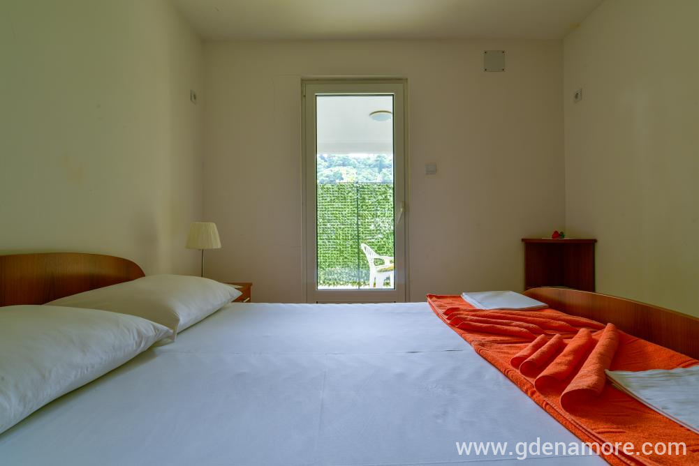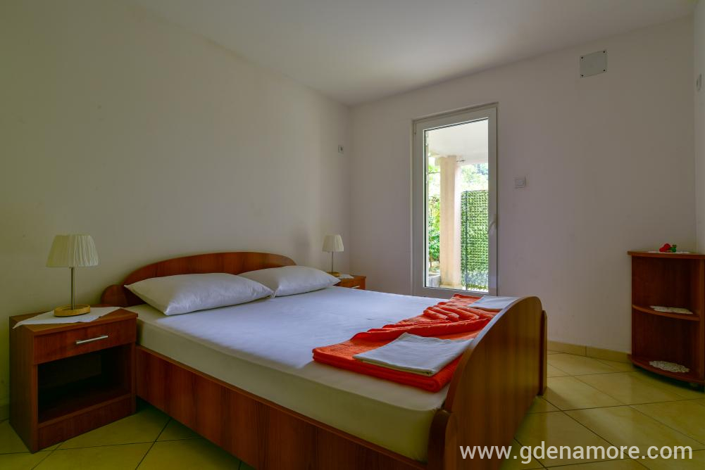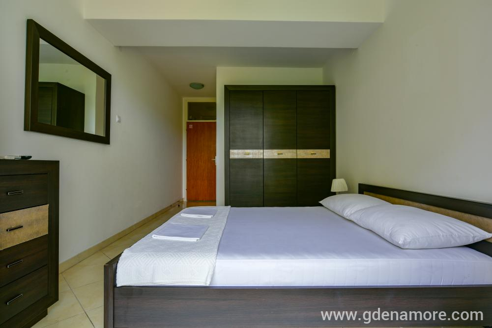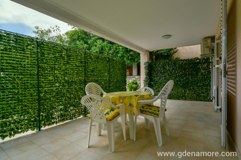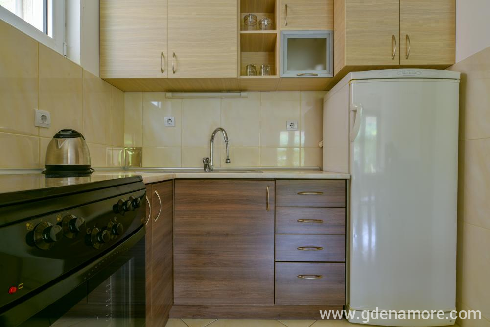 Poseduje odvojenu dvokrevetnu sobu i mogucnost korišćenja ležaja za dvoje u dnevnom boravku, kompletno opremljenu kuhinju, kupatilo, prostranu terasu, ,klima uredjaj, WI-FI,kablovska tv, parking u dvorištu kuće.