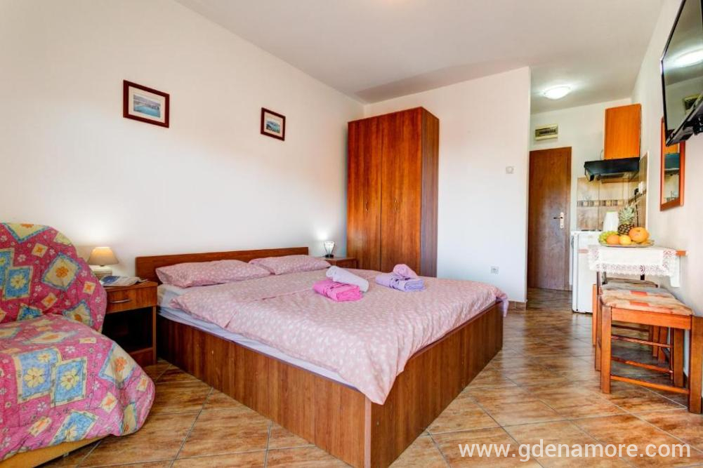 Studio u prizemlju za 2+1 sa francuskim krevetom i single krevetom. Kuhinja, kupatilo, wi-fi, led TV, klima, terasa ispred studia. Bazen ispred vile.