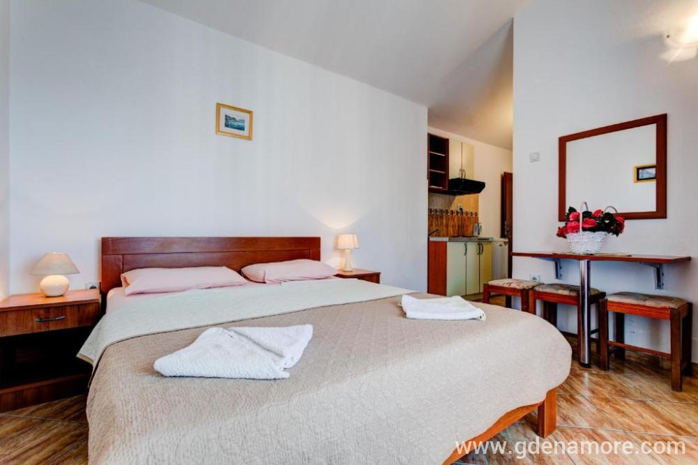 Studio za dvoje sa francuskim krevetom. Studio je opremljen kuhinjom, kupatilom, wi-fi, TV, terasa. Bazen ispred vile.