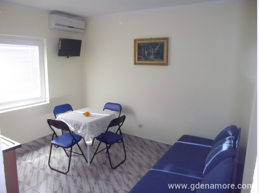 Ovaj studio posjeduje francusku lezaj i fotelju na razvlacenje.Isti posjeduje veliku terasu sa mini-kuhinjom,kupatilom i WI-FI.Studio je na prvom spratu.