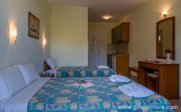 Na 100 metara od velike plaže u Sartiju, nalazi se 16 soba u koje se mogu smestiti 4 osobe i 2 apartmana koji su idealni za porodice i u koje se mogu smestiti 4 osobe. Sve sobe imaju velike balkone sa predivnim pogledom na more, sopstveno kupatilo, telefon, satelitsku televiziju, klimu i potpuno opremljenu kuhinju.